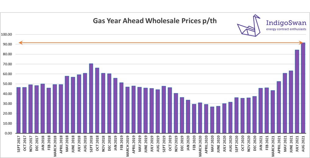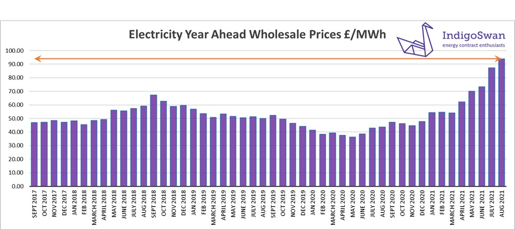 On the 9th of August, the Electricity Year Ahead Wholesale cost was £94.02/MWh, up from £87.41/MWh in last month’s report and 115% higher than 2020. Prices from quarter two of 2022 are considerably lower.