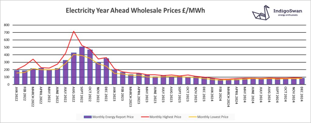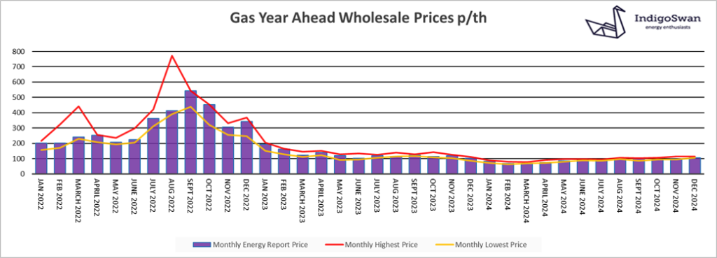 On the 10th of December, the Electricity Year Ahead Wholesale cost was £85.25/MWh, up from £80.41/MWh in last month’s report and 9% less than 2023. Prices did reach 92.13p/th before easing through December.