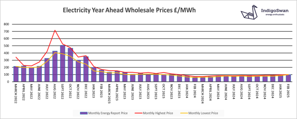 On the 3rd of February, the Electricity Year Ahead Wholesale cost was £100.20/MWh, up from £89.38/MWh in last month’s report and 56% more than 2024.