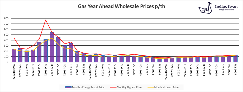 On the 3rd of February, the Gas Year Ahead Wholesale cost was 125.11p/th, up from 114.38p/th in last month’s report and 81% more than 2024.