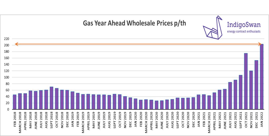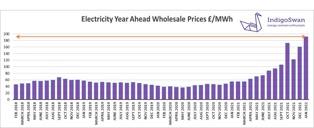 On the 4th of January, the Electricity Year Ahead Wholesale cost was £191.26/MWh, up from £160.05/MWh in last month’s report and 253% higher than 2021. Prices later in the year and 2023, are considerably lower.