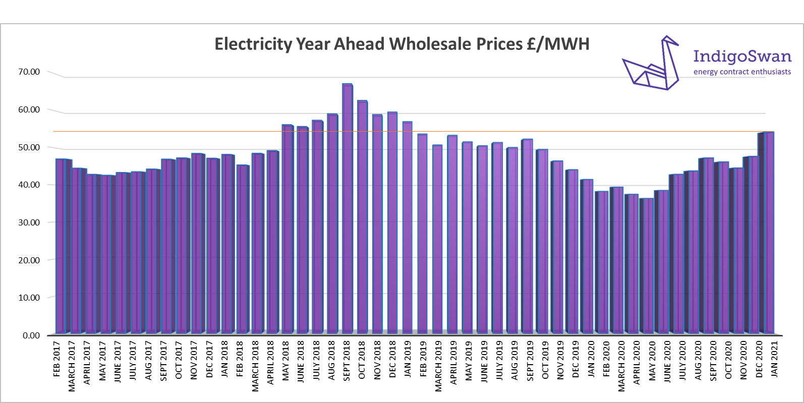 On the 5th January, the Electricity Year Ahead Wholesale cost was 54.21 (£/MWh), from 47.68 (£/MWh) in last month’s report and 31% higher than 2020.
