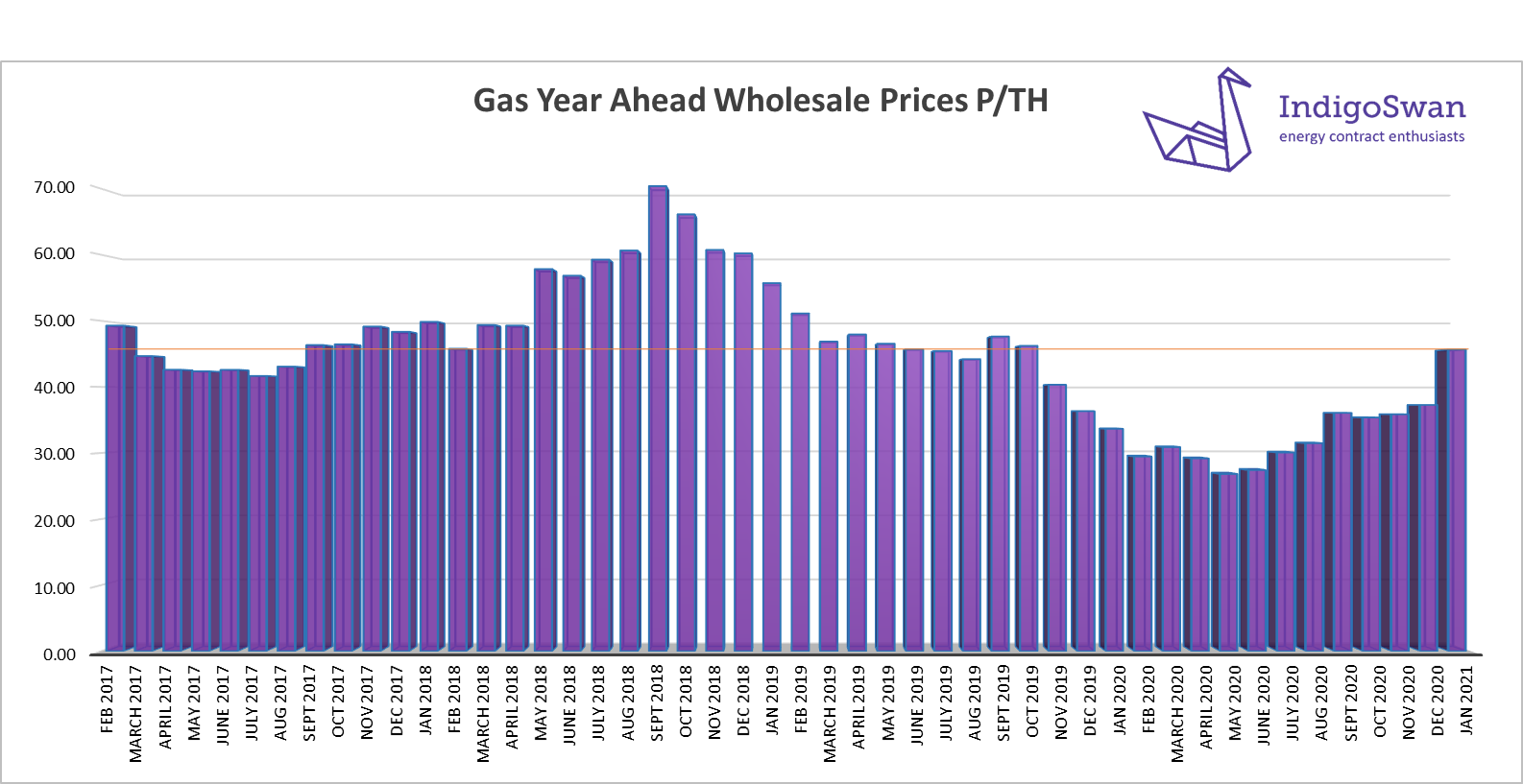 On the 5th January, the Gas Year Ahead Wholesale cost was 45.65 (p/th), from 37.27 (p/th) in last month’s report and 35% higher than 2020.