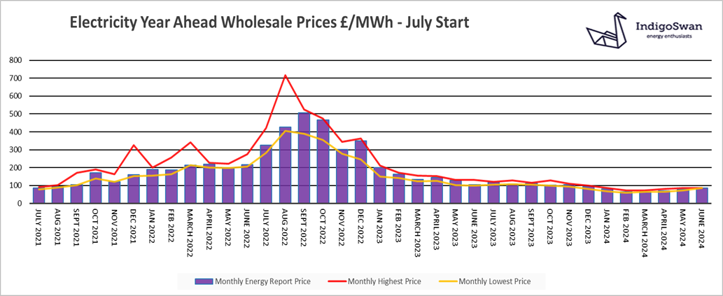 On the 3rd of June, the Electricity Year Ahead Wholesale cost was £87.39/MWh, up from £77.12/MWh in last month’s report but 18% less than 2023.