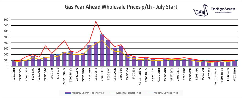 On the 3rd of June, the Gas Year Ahead Wholesale cost was 97.67p/th, up from 87.79p/th in last month’s report but 5% less than 2023.