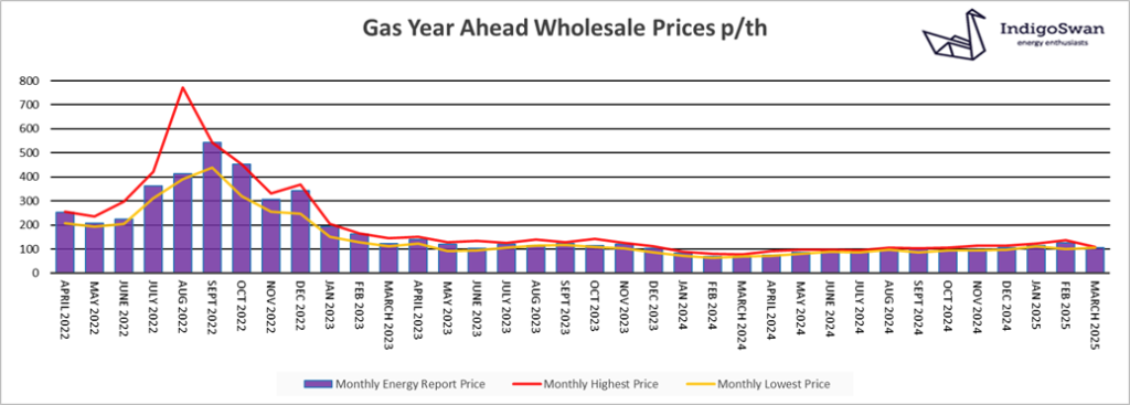 On the 4th of March, the Gas Year Ahead Wholesale cost was 105.12p/th, down from 125.11p/th in last month’s report and 51% more than 2024.