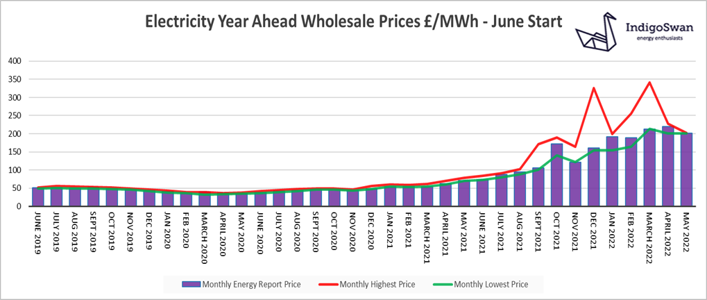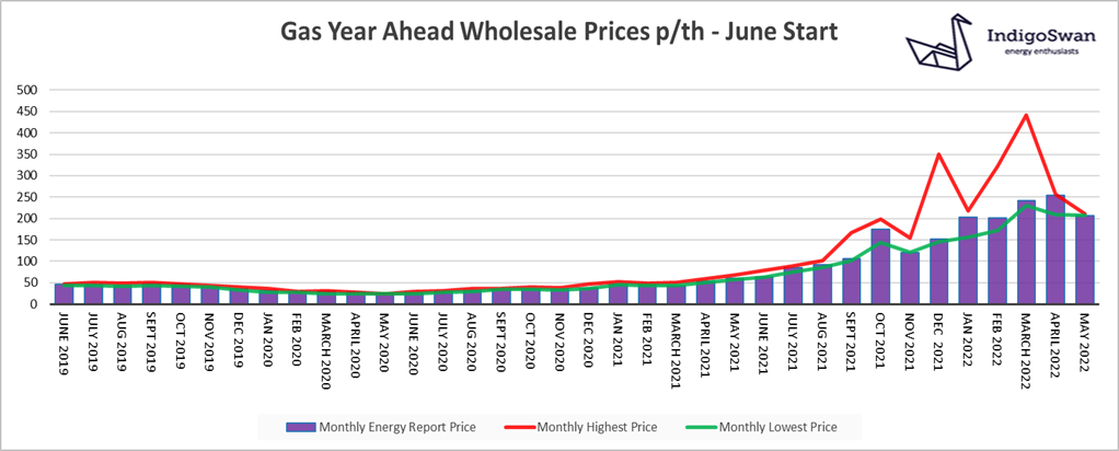 On the 3rd of May, the Electricity Year Ahead Wholesale cost was £201.35/MWh, down from £220.10/MWh in last month’s report and 187% higher than 2021. Prices for 2023 and 2024 are considerably lower.