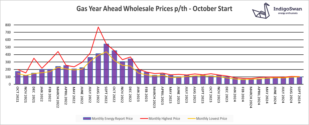 On the 2nd of September, the Gas Year Ahead Wholesale cost was 100.55p/th, up from 99.56p/th in last month’s report and 19% less than 2023.