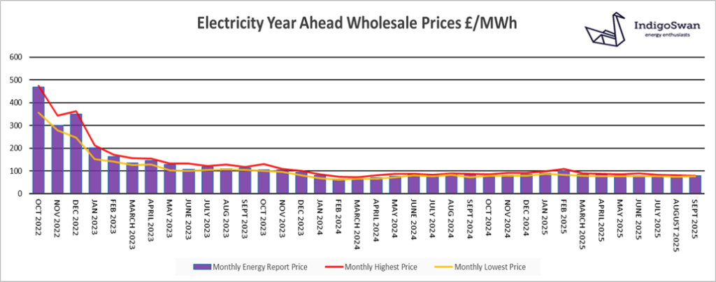 On the 1st of September, the Electricity Year Ahead Wholesale cost was £77.85/MWh, down from £80.30/MWh in last month’s report and 9% less than 2024.