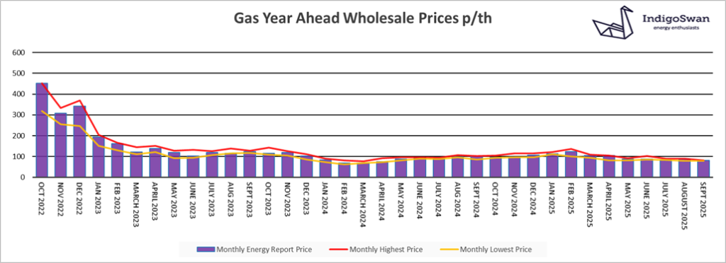 On the 1st of September, the Gas Year Ahead Wholesale cost was 81.52p/th, down from 88.46p/th in last month’s report and 19% less than 2024.