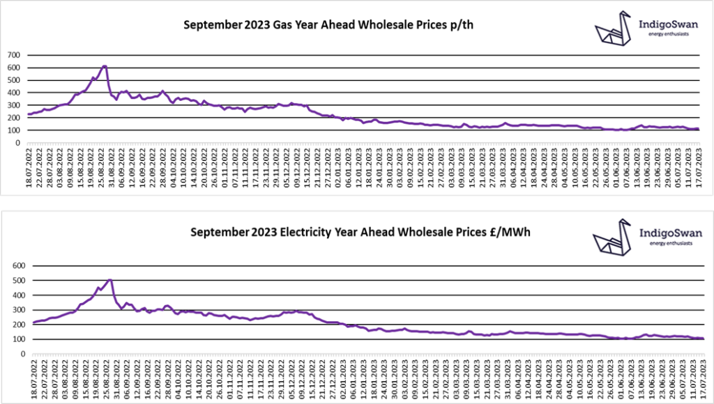 Although the last week has seen a degree of price stability with a small downward trend, there remains the potential for large % swings with some nervousness remaining. Prices are in the region of 70% lower than July 2022, with a premium against 2020 and early 2021, but it is generally considered unlikely that we will see those low levels for some time. Therefore, we would advise discussing your options for contracts ending in 2023 and early 2024 with Indigo Swan.