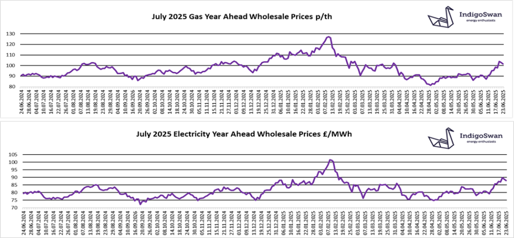Over the last week, energy markets continued to include a premium in anticipation for the disruption to Oil and LNG supplies from the Middle East. UK Wholesale Gas costs increased in the region of 15% in two weeks, which impacted on Electricity due to its use for generation. The missile strikes by the US on Iranian Nuclear facilities made it more likely that Iran would close the Strait of Hormuz, which would drive-up global costs. However, on the evening of the 23rd of June, Iran’s retaliation was a symbolic missile attack on a US base. This had little threat, but the perception of taking action, allowed them to agree to a ceasefire with Israel, that for now has reduced much of the concern, which is being reflected in lower costs.