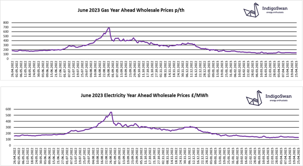 Wholesale prices are currently in the region of a fifth of the peaks we saw in 2022, but still show a premium against 2020 and early 2021. It is generally considered unlikely that we will see those low levels for some time. There has been little price movement over the last four months, although there is a downward trend. Concern remains that an unexpected event, which has not been factored into costs, could once again see increases. Therefore, we would advise discussing your options for contracts ending in 2023 with Indigo Swan.