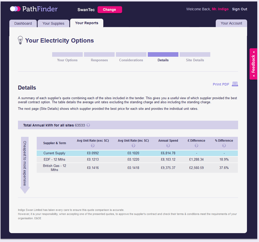The Details Page is a summary of all the quotes received. This is especially useful if the tender is for multiple supplies as it totals all the costs and provides you with an average unit rate excluding the standing charge element and also including the standing charge.