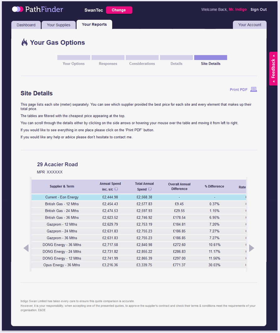 Next is the Site Details page, it lists each meter separately so you can see which supplier provided the best price for each site. To scroll through the table you can either click the arrow buttons or hold your mouse over the table to move the table to the left or right.