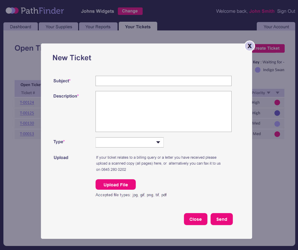 Click on the ‘Create Ticket’ button fill in the subject of your ticket, description, type of query and press send. You can even upload any images associated with this ticket if needed – for example a copy bill or letter received from the supplier.
