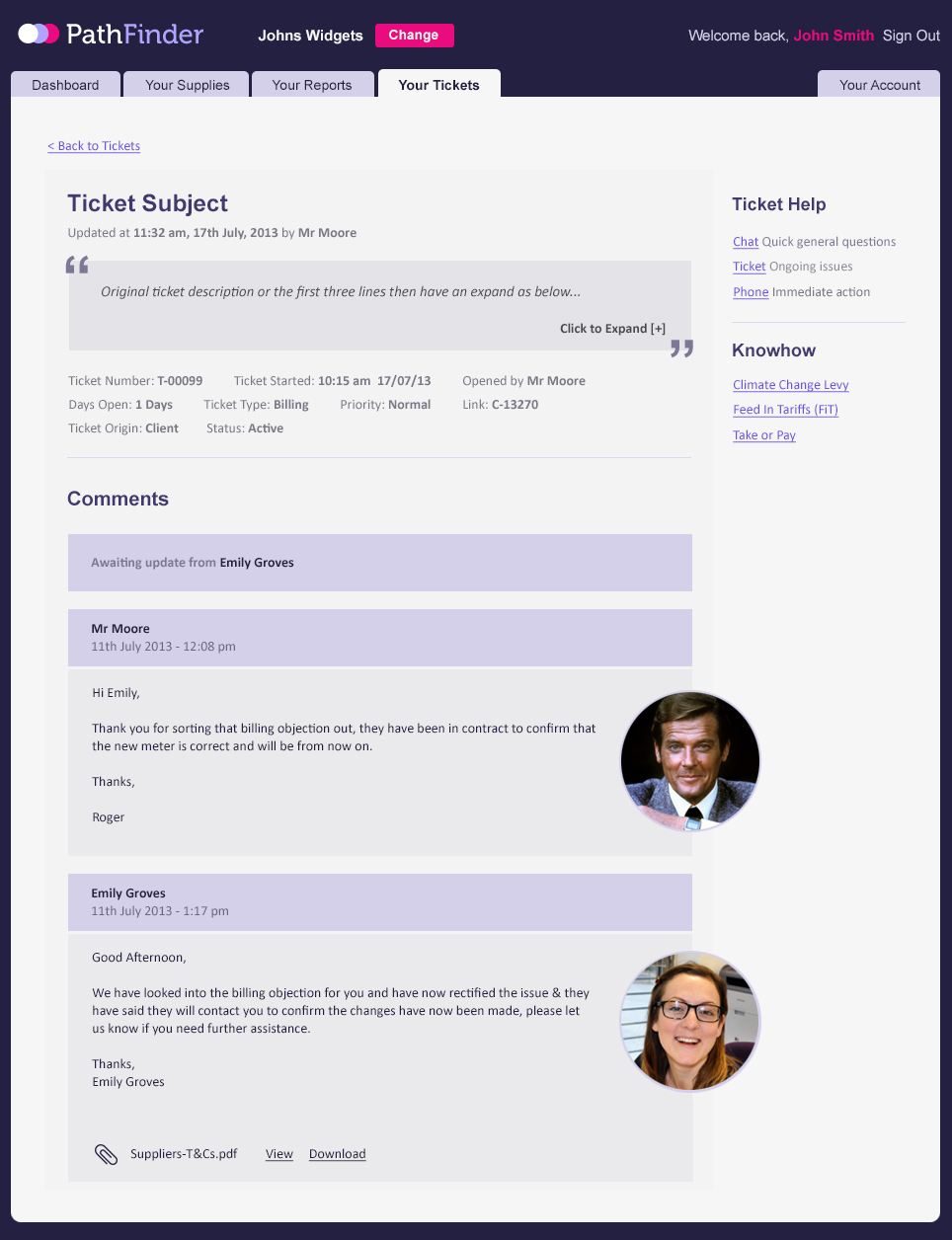 The ticket page is a call-response two way tracked conversation between yourself and us to help you get your energy related issues all sorted out.